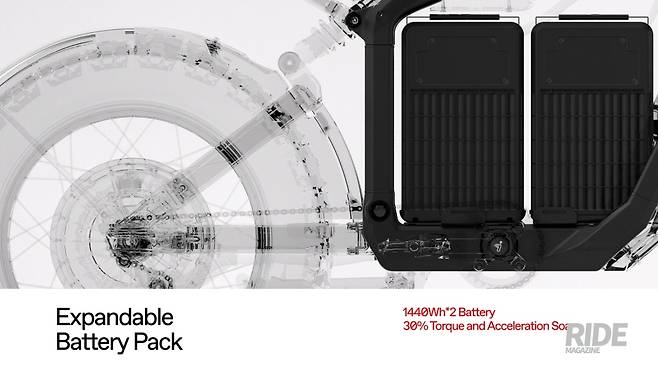 프레임 내부에 2개의 배터리를 장착하는 구조로 되어 있어 주행거리를 최대한 늘릴 수 있도록 제작됐다. 언뜻 보면 전기 모터사이클처럼 보이지만 엄연히 페달이 달린 전기자전거로 전기의 힘이 없어도 페달을 주행이 가능하다.