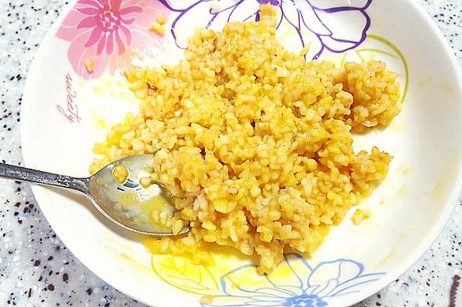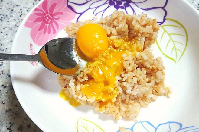 찬밥 한 공기를 활용하시면 좋고요. 보온된 밥은 미리 펼쳐서 식혀 주신 다음 노른자와 소금을 넣고 잘 섞어주세요.
