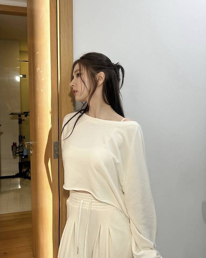 반면 실내에서 촬영된 두 번째와 세 번째 컷에서는 크리미한 화이트 톤의 크롭 탑과 팬츠 세트를 입고 내추럴한 헤어와 함께 부드러운 여성미를 강조했습니다.