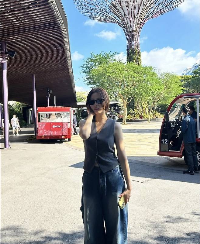 신세경은 딥한 브이넥 슬리브리스 베스트에 와이드 데님 팬츠를 매치해 도시적인 시크함을 연출했고, 블랙 선글라스로 마무리하며 리조트 감성의 쿨한 무드를 더했습니다.