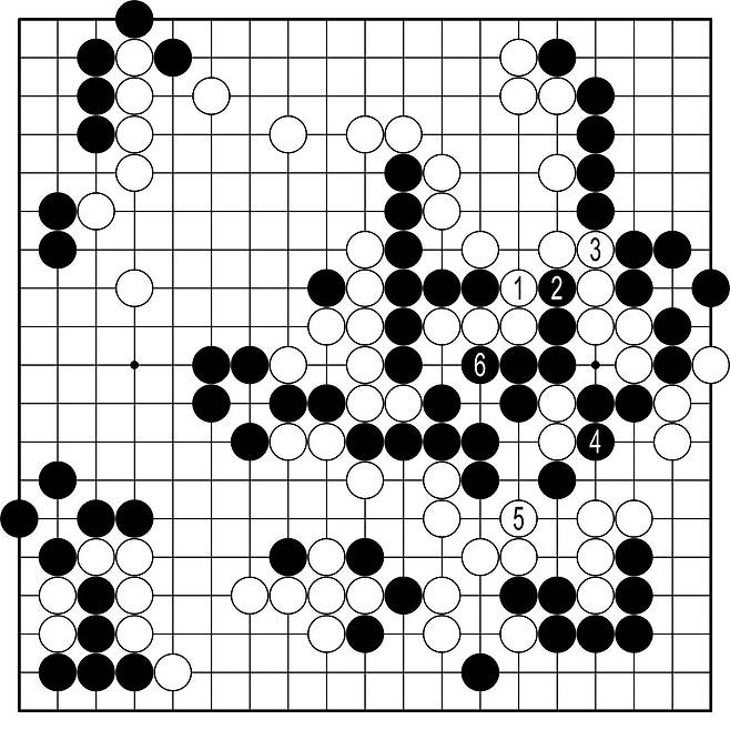 ◆참고도=백이 항복하지 않고 1로 연결하면 흑은 2를 선수하고 4로 잡는다. 백5로 연결하면 흑6으로 산다. 공격과 수비에 따라 수많은 그림이 그려지는 난해한 수읽기였으나 박정환은 정확히 삶을 찾아냈다. 박정환은 8강에 올랐다.