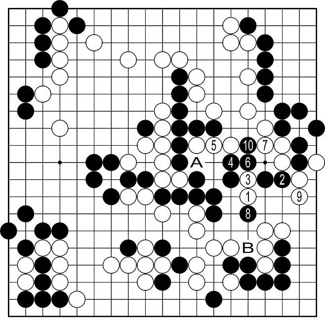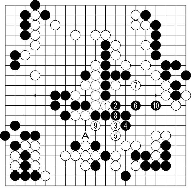 장면⑧=백은 승부수를 던져 흑 대마를 절단했다. 그렇다면 어떻게 공격할 것인가. 지금은 단순 공격으로는 안 된다. 반드시 숨통을 끊어야 승리할 수 있다. 한데 AI는 아무 짓도 하지 말고 A로 두 점을 살려오라고 한다. 사실 그게 흑으로서도 가장 어려운 시험대였다. 하나 승부를 비관해서 옥쇄 전법을 선택한 시바노는 그렇게 잠자코 있을 수 없었다. 백1로 찌른 수, 우선 이 수가 나빴다. 1에 이어 3을 선수하려는 것이지만 결국 9로 살려야 했다. 이때 박정환은 10으로 들여다봤는데 평범한 이 수가 아주 좋았다.