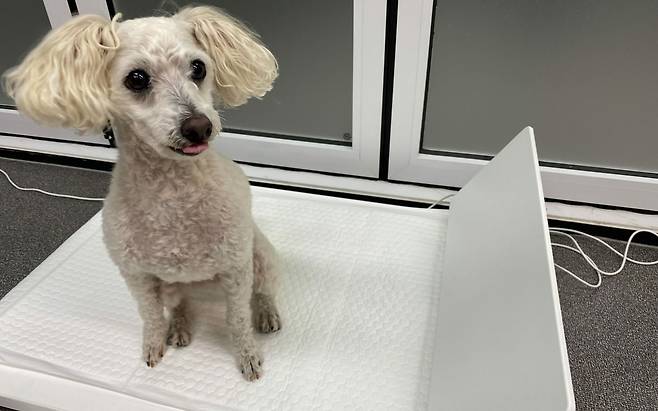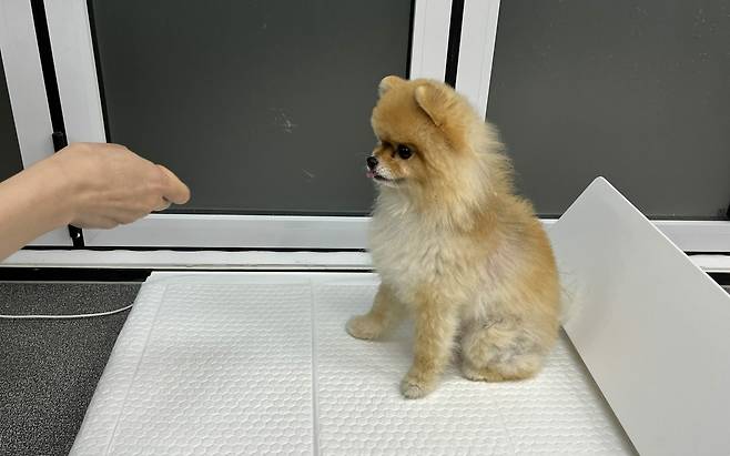 나루는 기존에 배변패드를 바닥에 두고 사용했어요. 펫토일렛은 바닥과 6cm의 단차가 있어서, 사용 시 훈련이 필요했습니다.