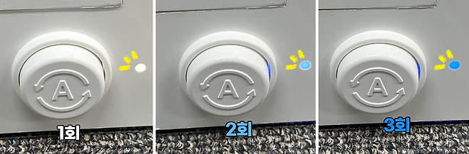 수동 청소 모드를 사용할 경우 버튼을 길게 눌러 직접 청소할 수 있어요. 자동 청소 모드를 켜 놓으면 배변 횟수에 따라 청소 빈도를 설정할 수 있습니다.(1~3회로 설정 가능) 그래서 강아지 배변 습관에 따라 청소 주기를 설정할 수 있다는 게 장점이에요.