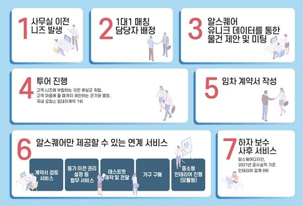 고객사 입장에선 알스퀘어 담당자와만 소통하면 공간 임대는 물론 계약 등 법무 검토에 이르기까지 관련 니즈를 편하게 소통할 수 있다. 알스퀘어 역시 공실과 중도 퇴실 정보를 지속적으로 파악해 담당자에게 전달하고, 더 많은 물건을 고객사에 빠르게 전달한다.