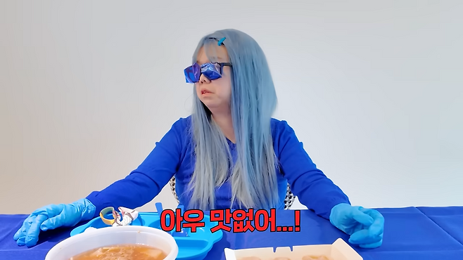 유튜브 ‘홍쓴TV’에서 공개된 영상 속 그녀는 온몸을 파란색으로 꾸미고, 파란 식탁에서 식욕 억제 효과를 시험했다.