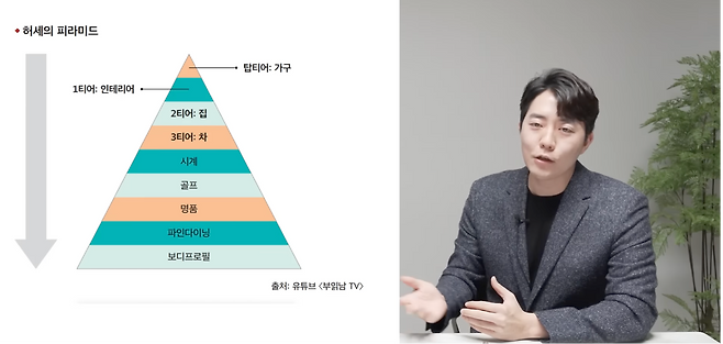 그리고 허세 피라미드의 상위로 올라 갈수록 돈의 단위가 달라집니다. 다른 명품보다 몇 배는 비싼 시계를 사고, 한강이 보이는 집에서 자연스럽게 찍은 사진을 올리며, 단순히 집만 자랑하는 게 아니라, 그 집의 실내장식까지 함께 올리며 ‘내가 원하는 대로 꾸민 내 집’이라는 점도 함께 어필하는 것입니다. 그리고 그 집에 어울리는 최고급 가구를 찍어 올리고 그 누구도 쉽게 따라 할 수 없는 최상위 클래스의 삶으로 관심을 한몸에 받습니다.