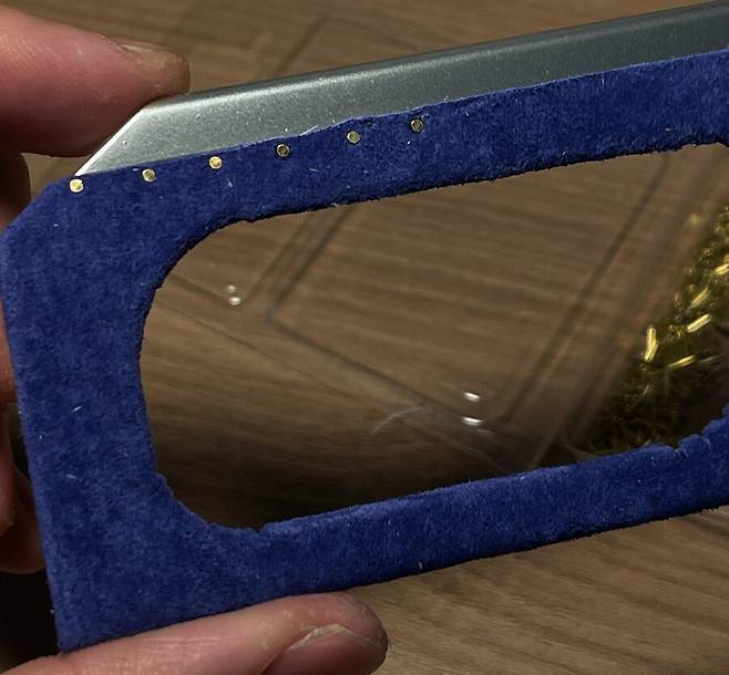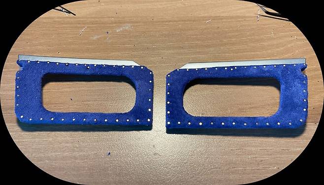너무 밋밋하여 스웨이드를 붙여주고 리벳을 황동 못으로 표현해 줍니다.