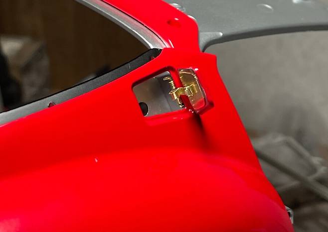 주유구와 냉각수 주입구 부분이 스티커라 경첩을 만들어 줍니다.