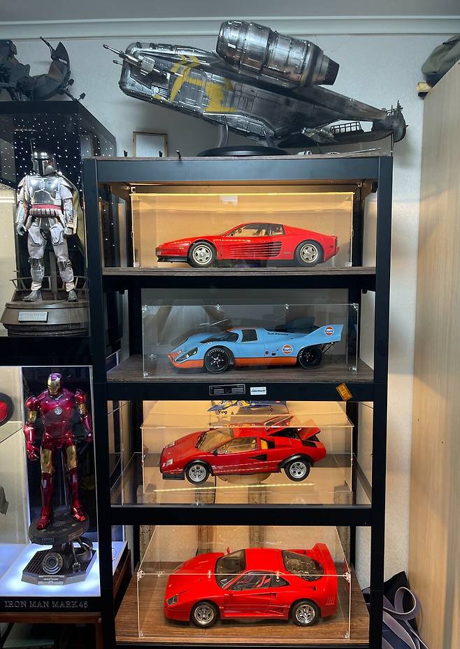 장식은 책장 한 칸을 빼고 나무 판을 놓고 아크릴 장과 LED를 추가해서 전시 하고 있습니다.