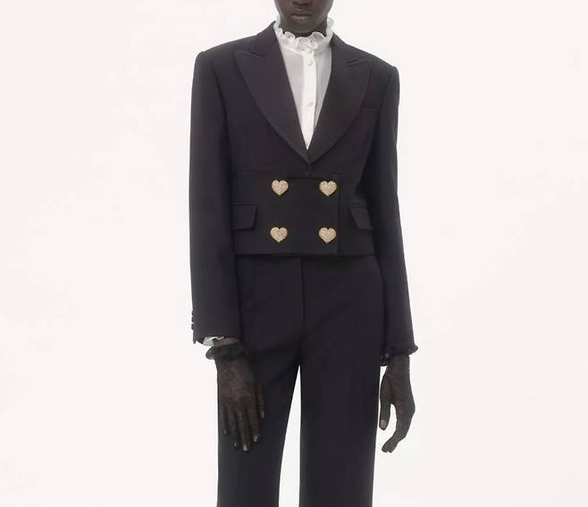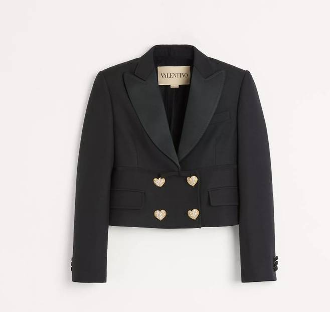 소녀시대 윤아 님이 착용한 블레이저는 바로 발렌티노(Valentino)의 25FW 신상, CREPE COUTURE JACKET이었습니다! 25FW 신상으로 출시된 이 아우터는 하트 보석 단추가 가장 눈에 띄는 포인트로 장식된 크롭 자켓입니다. 전체 소재는 크레이프 쿠튀르이며, 버진 울 65%와 실크 35%가 혼방되어 고급스러움을 더했습니다.