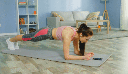 매트에 팔뚝을 대고 엎드려 팔꿈치 플랭크 자세로 준비합니다. 머리부터 발끝까지 몸이 일직선이 되도록 곧게 뻗고, 시선은 바닥을 향합니다. 복부에 힘을 주어 중심을 잡으며 자세를 유지합니다.