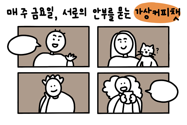 재택은 계속 이어져야 하기에 나름대로의 방법을 고민하다 ‘가상 커피 챗(virtual coffee chat)’ 프로그램을 알게 되었어요. 지금은 제 주변에서도 많이 적용하고 있는 방법으로 재택을 하며 서로 알아가며 대화를 나눌 수 있는 시간인데요. 저를 포함한 프로젝트 팀은 매일 오전 10시에 슬랙 - 허들에 접속해 이야기를 나누고 있어요.