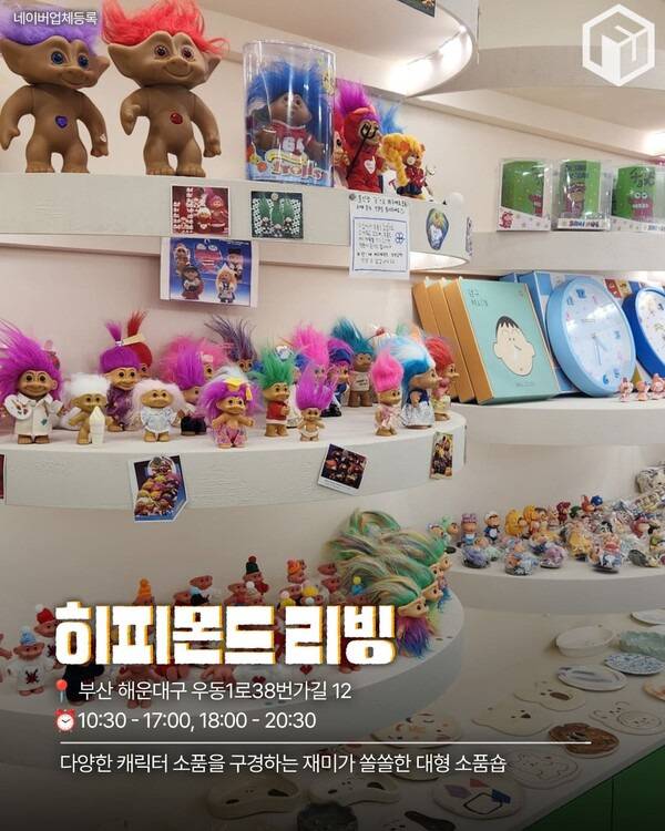 히피몬드리빙은 캐릭터 소품을 사랑하는 이들에게 딱 맞는 부산 소품샵입니다. 넓은 매장 안에는 각종 귀여운 캐릭터 인형, 문구, 생활소품이 다양하게 전시되어 있어 구경하는 재미가 쏠쏠합니다.