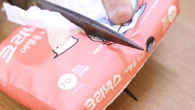 티슈 한 장, 너무 길어서 절반만 사용해도 충분할 때가 많죠? 이럴 때는 플라스틱컵과 뚜껑을 활용해보세요. 먼저 티슈를 반으로 잘라 줍니다.