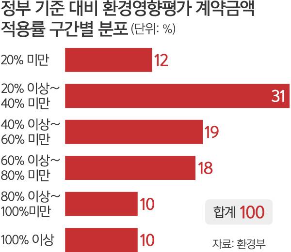 개발을 추진하는 사업자가 환경영향평가를 전문업체에 맡기면서 지불하는 돈이 정부 산정 기준액 대비 50%대에 불과한 것으로 확인됐다. 정부가 용역을 맡겨 환경영향평가 발주한 사례를 심층 분석한 결과다. 2012년 환경영향평가 대행비용 산정기준을 새로 만든 이후 실제 이 기준 적용 실태를 정량적으로 분석한 건 이번이 처음이다.