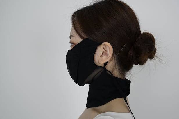 천으로 얼굴을 덮는 마스크가 아닌 옷처럼 입는 마스크입니다. 4개의 천을 얼굴 윤곽에 맞도록 재단해 재봉 처리했습니다. 탈부착 가능한 벨크로 방식으로 목 뒷부분까지 감싸서 보호할 수 있습니다.
