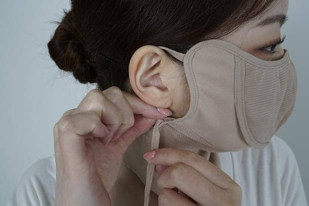 보통 마스크의 귀 조절부는 귀 바로 뒤에 있어서 안경이나 선글라스 착용했을 때 걸리적 거리는데요. 귀 조절부를 귀 밑부분으로 내려서 불편한 점을 해소했습니다.