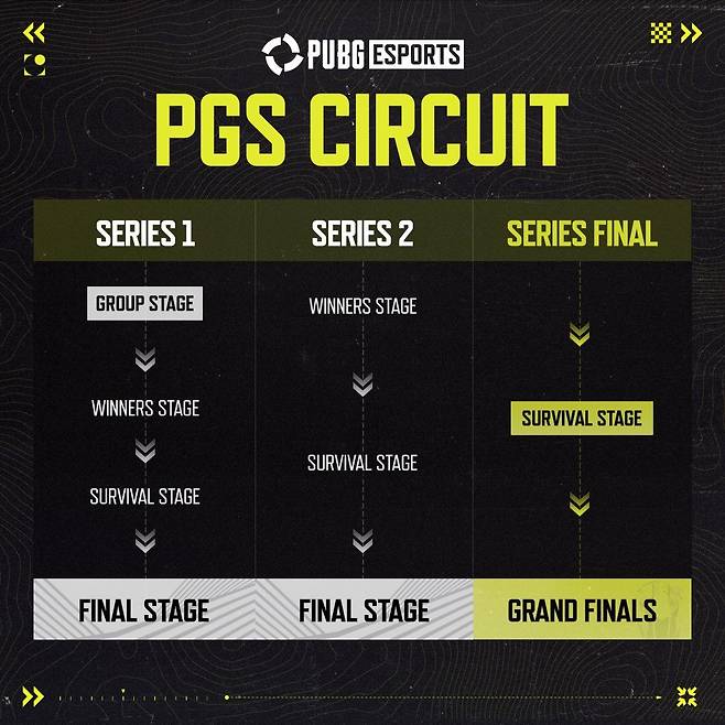 이번 PGS 서킷 1은 1, 2, 3 총 세 개의 시리즈로 구성한다. 각 시리즈 성적이 누적되는 구조다. 먼저 시리즈 1은 18일부터 22일까지 진행된다. 첫날 그룹 스테이지를 시작으로 이후 하루마다 위너 스테이지와 서바이벌 스테이지를 거쳐 파이널 스테이지가 펼쳐진다. 여기에서는 24개 팀이 모두 동일한 조건에서 출발해 첫 번째 서킷 순위를 결정하게 된다.