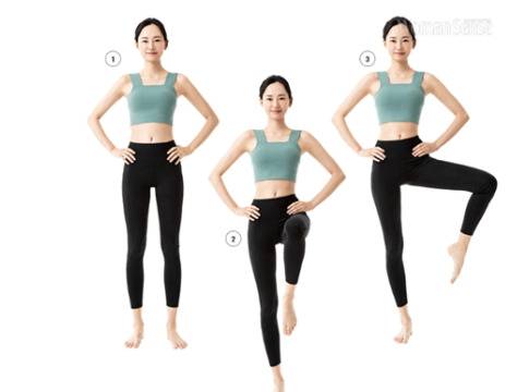 동작 응용 팁: 벽을 짚고 한쪽 발목을 잡아 엉덩이 쪽으로 당깁니다. 허리가 꺾이지 않도록 복부에 힘을 주고, 무릎이 벌어지지 않게 유지합니다.