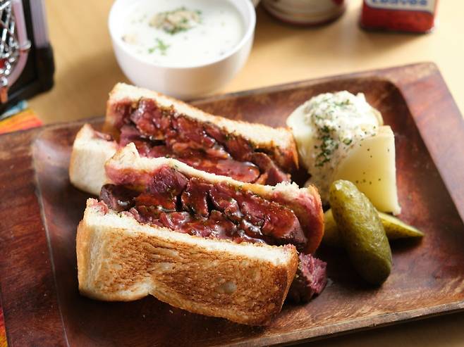 먼저 발견한 가게는 스태블러입니다. 시모키타의 상징과도 같은 빈티지 의류로 내부를 채웠어요. 그런데 메인 메뉴는 옷이 아닌, 고기 샌드위치입니다. 스테이크를 세 겹이나 쌓아 두께감을 자랑하죠.