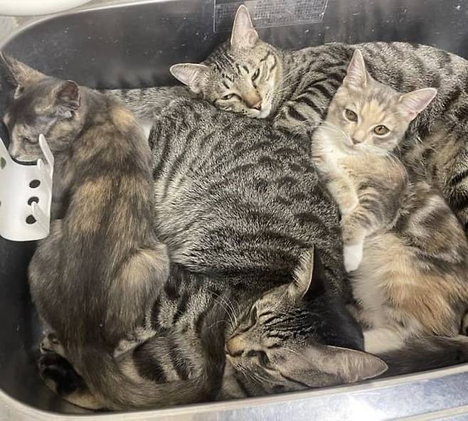 시원했는지 한 고양이는 두 눈을 지그시 감은 채 잠을 청했고 다른 고양이들은 불편하지도 않은지 서로의 몸에 포개어 누워 있었는데요.