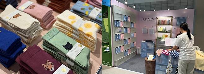 수건만 판매하는 부스도 있었다. 전시관 끝쪽에 자리 잡은 수건 큐레이션 브랜드 ‘더그란’이었다. 더그란은 부스 전체를 핑크톤으로 통일하고 하늘색과 핑크색의 수건을 핵심 제품으로 내세웠다.