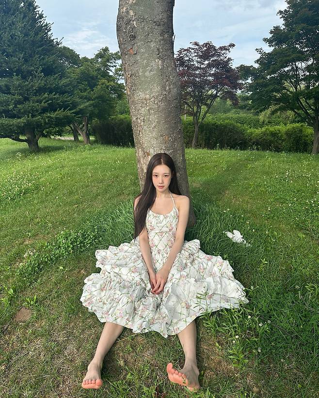 맨발로 나무 그늘 아래 앉아 있는 모습에서는 꾸미지 않은 자연스러움이 느껴져요.