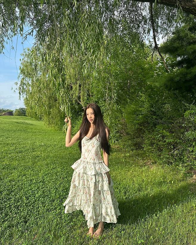그녀가 선택한 드레스는 플라워 패턴이 가득한 러플 맥시 원피스로, 로맨틱한 무드가 자연 속 배경과 완벽하게 어우러지죠.