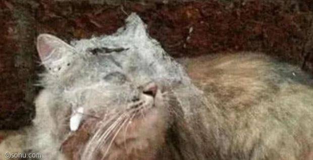 고양이는 얼굴에 거미줄이 잔뜩 붙은 채 충격적인 몰골을 하고 있었다.
