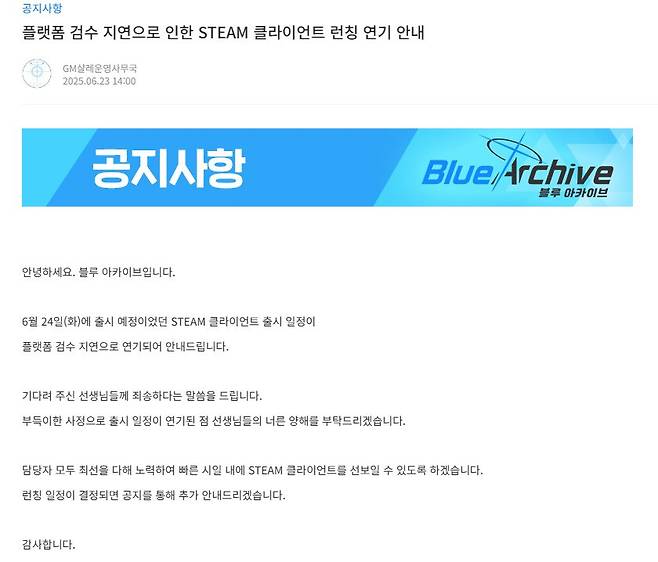 블루 아카이브 스팀 버전 출시일은 공식 포럼 및 스팀 페이지를 통해 추후 재공지될 예정이다.