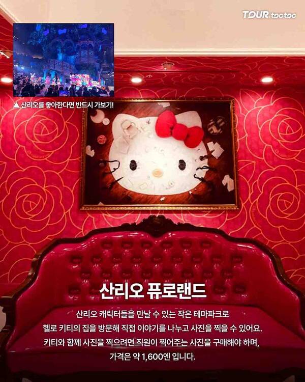 도쿄 다마시에 있는 산리오 퓨로랜드는 헬로키티뿐만 아니라 산리오 캐릭터 전체를 아우르는 실내 테마파크다. ‘Meet & Greet’ 프로그램에서 직접 키티와 대화하고 사진을 찍을 수 있으며, 퍼레이드와 공연도 정기적으로 열린다.