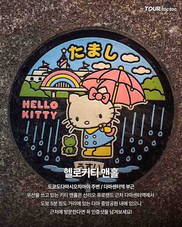 도쿄 다마센터역 주변에는 길바닥에 헬로키티 디자인이 새겨진 특별한 맨홀이 있다. 무료 포토존이자 산리오 퓨로랜드 방문 전후에 들르기 좋은 일본 헬로키티 여행 코스다. 블로그 후기에 따르면 현지인들도 종종 발길을 멈추고 사진을 찍을 만큼 귀여움이 폭발한다.