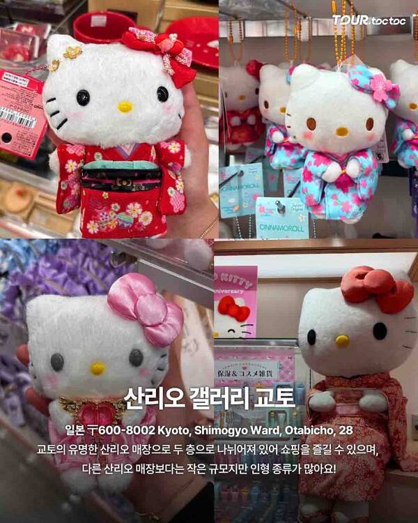 교토 중심지에 위치한 산리오 갤러리는 작지만 인형 종류가 다양하고 교토 한정 굿즈를 판매한다. 니시키 시장이나 기온 거리와 함께 방문하기 좋아 여행 동선 짜기 편리하다.