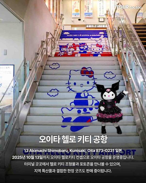 오이타 공항은 2025년 10월 13일까지 헬로키티 테마로 운영된다. 터미널 곳곳이 포토존이며, 면세점에서는 공항 한정 키티 굿즈를 판매한다.