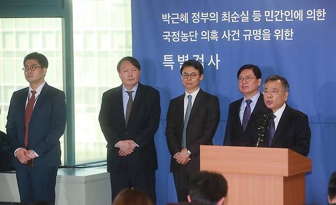 | ▲ 2017년 3월 6일 '박근혜 정부의 최순실 등 민간인 국정농단 사건' 수사 특별검사팀 박영수 특별검사가 6일 오후 서울 강남구 특검사무실에서 최종 수사결과를 발표하고 있다. (사진 왼쪽부터 홍정석 부대변인, 윤석열 수사팀장, 이규철 특검보, 박충근 특검보, 박영수 특검) |