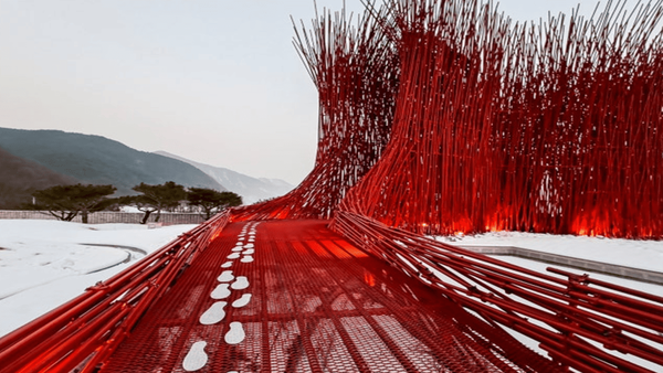 감성적인 예술 공간을 찾는다면 ‘젊은달 와이파크’는 빼놓을 수 없는 장소인데요. 입구부터 눈길을 사로잡는 붉은 대나무 조형물은 겨울 풍경 속에서 더욱 강렬한 인상을 남깁니다. 설경과 현대 예술이 어우러진 이색적인 조합이 여행의 시작을 특별하게 만들어줍니다.