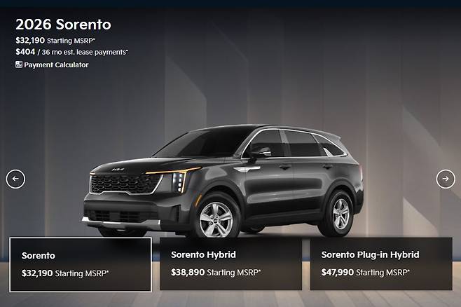 얼마 전 미국 시장에서 기아 쏘렌토가 2026년형으로 연식 변경을 거쳤다. 연식 변경 신차가 통상적으로 그래왔듯 기본형 LX 트림 기준 시작 가격은 200달러 인상된 3만 2,190달러가 책정됐다. 탁송 비용도 1,415달러에서 30달러 인상된 1,445달러로 정해졌다.