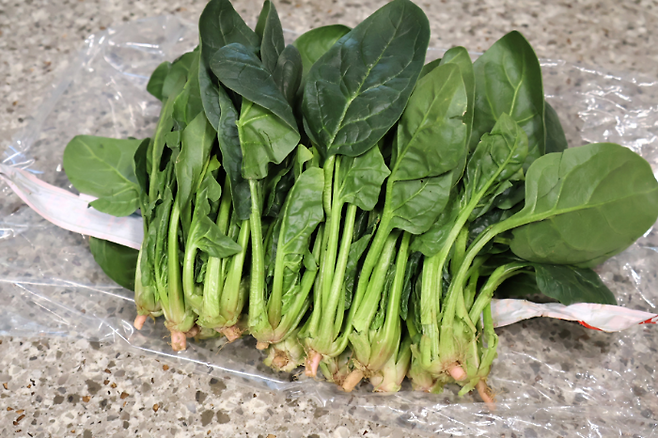 시금치 한 단을 사서 왔어요. 시금치는 뿌리 쪽 부분에 보라빛이 많이 띄는 것이 단맛이 좋아요. 나물용으로 무칠 때는 줄기가 긴 것 보다 짧은 것이 더 맛있어요.