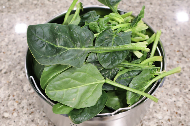 손질 끝났어요. 손질이 끝난 시금치는 씻지 않은 채로 그냥 데칠거예요. 데치지 않는 이유는 두가지 인데 요즘은 노지 시금치가 아니기 때문에 그리 지저분하지 않고, 씻고 바로 데치면 시금치 온도가 낮아져서 데치는 시간이 길어져 식감이 뭉개지기 때문이랍니다.