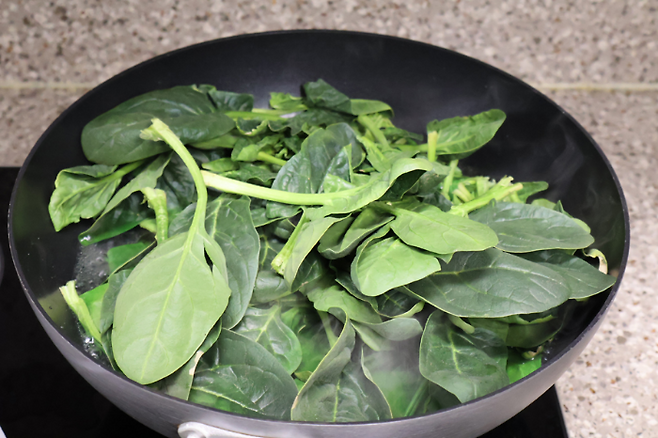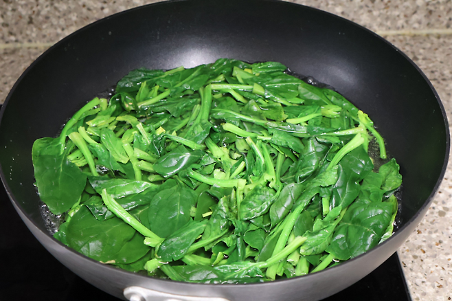 이게 숨이 죽은 상태에요. 뻣뻣했던 시금치가 부드럽게 물 속에 들어가면 바로 불을 꺼요.