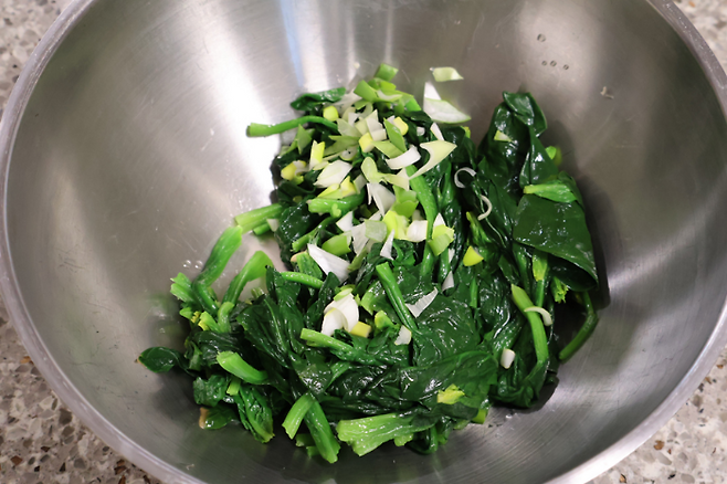 씻은 시금치는 물이 뚝뚝 떨어지지 않을 정도로만 물기를 짜고 볼에 담아요. 대파도 총총 썰어서 넣고요.