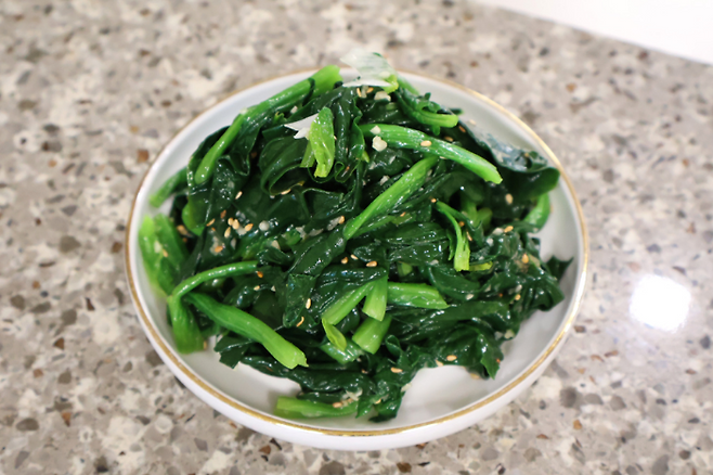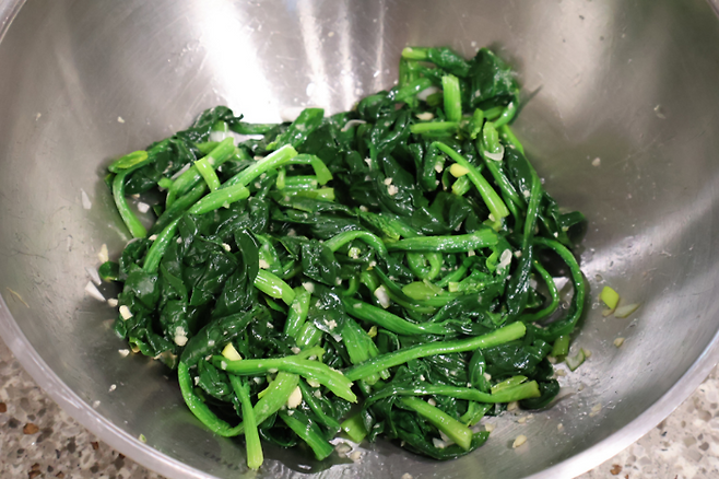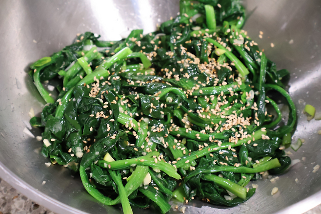 조물조물 버무린 시금치를 맛 보세요. 싱거운 것 같을 땐 소금을 조금씩 더 넣어서 간간하게 맞추면 됩니다.