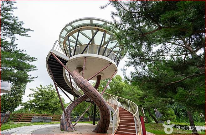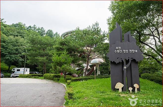해발 520m 지점에 설치된 전망대는 포천의 진산이라 불리는 수원산 정상에 자리하고 있습니다. 천연기념물 부부송을 형상화해 만든 조형물과 버섯을 닮은 쉼터 정자는 지역의 상징성을 고스란히 담아냈습니다.