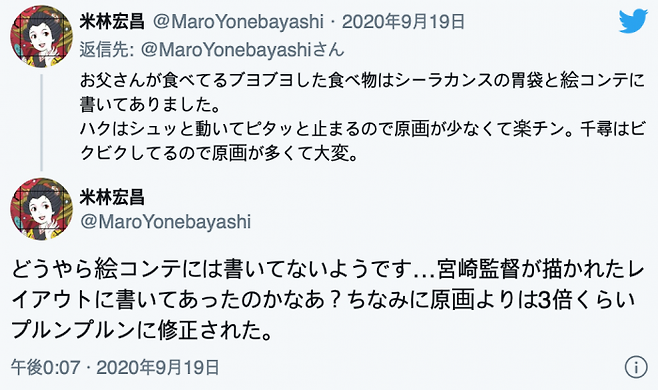 스튜디오 지브리 소속 애니메이션 감독인 요네바야시 히로마사(51)는 지난 2020년 9월 자신의 트위터에 2002년 한국서 개봉한 '센과 치히로의 모험'에서 팬들이 궁금해했던 일부 설정에 대한 설명글을 게재했다.
