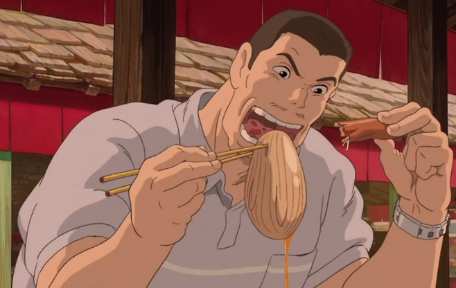 가장 먼저 눈에 띄는 것은 극 초반, 치히로의 부모가 정체불명의 음식을 먹어치우고 돼지로 변하는 장면이다. 개봉 당시에도 치히로의 아빠가 우걱우걱 입에 욱여넣는 주머니같은 물체를 둘러싸고 논란(?)이 있었는데, 여기에 대해 요네바야시 감독은 "(콘티 상으로)실라칸스의 위장"이라고 털어놨다.