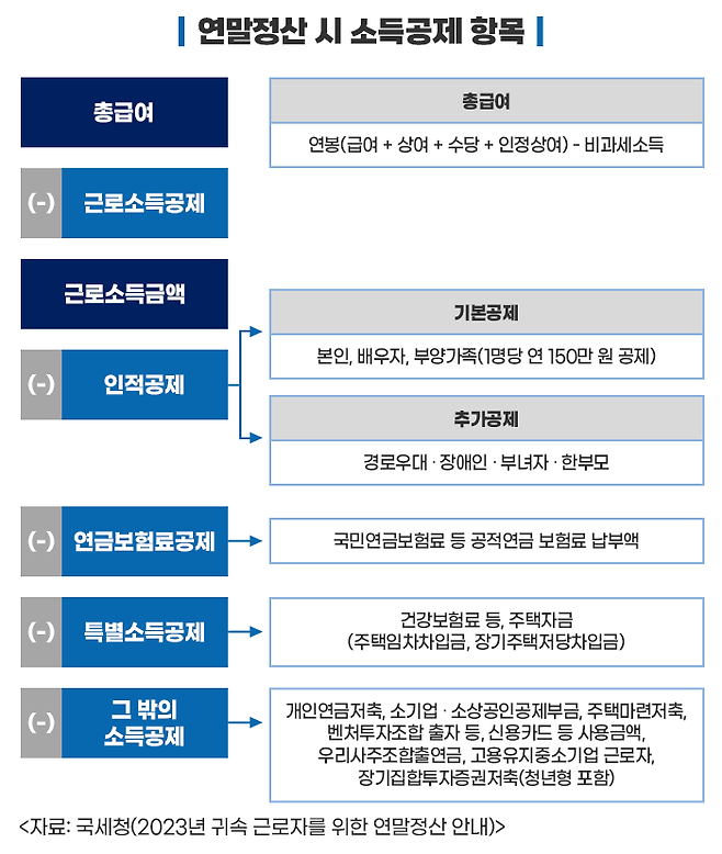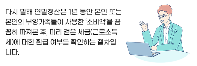 그래서 일단 세금을 대략 먼저 떼고, 한 해가 지난 후(보통 2월경), 연말정산을 통해 실제로 내야 할 최종 세금을 계산하는 것입니다.