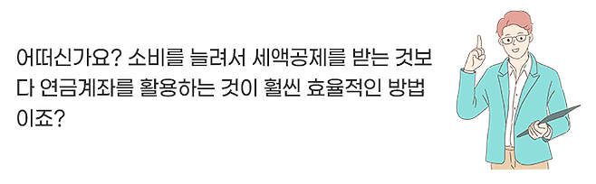 연금계좌를 활용하면 다른 공제와 달리 소비가 아닌 저축과 투자한 자산에 대해 공제를 받을 수 있다는 것을 알 수 있었는데요.