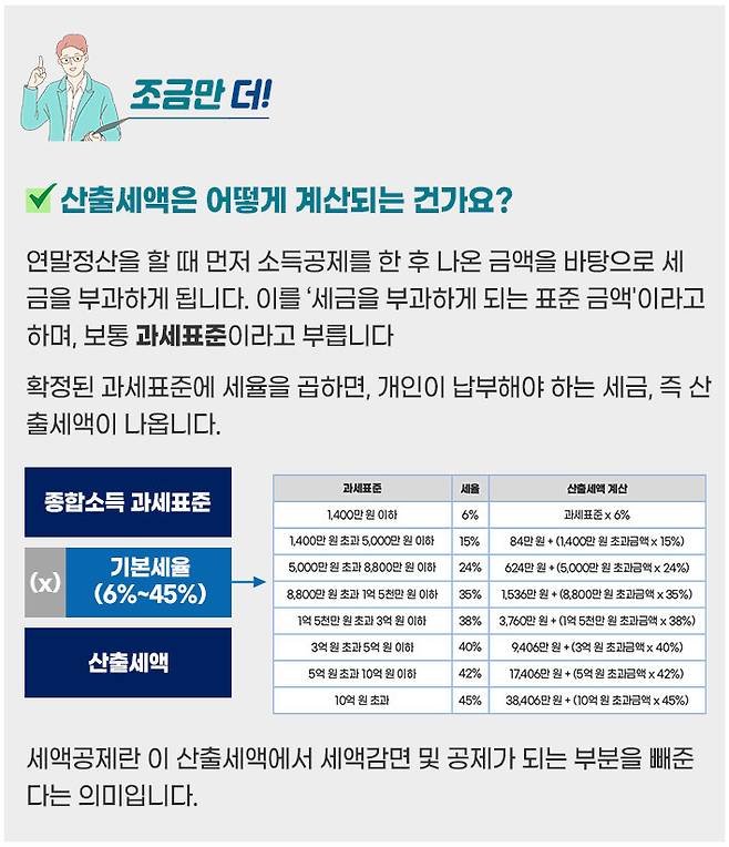 이렇게 소득 규모를 줄여준 뒤 이를 토대로 내야 할 세금, 즉 산출세액을 산출합니다.