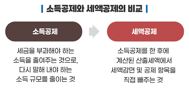 소득공제와 세액공제를 비교해서 설명해 드리자면, 소득공제는 내가 번 금액인 ‘소득’ 부분에서 공제(내가 쓴 돈)를 해주는 것으로 보시면 이해가 쉬우실 겁니다.
